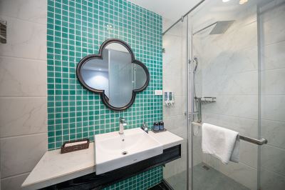 Bathroom with shower with overhead rain